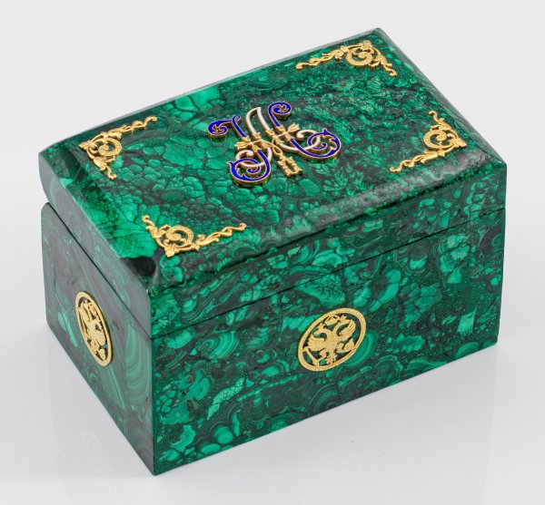 im Stil von Karl Fabergé. Malachit und Silber, vergoldet. Quaderförmiger Korpus. Auf flachem Scharnierdeckel mittig aufgelegtes blau und weiß emailliertes, ligiertes Monogramm. Die Ecken mit Blattranken verziert. Auf der Wandung applizierte Rundmedaillons mit Doppeladler. Gest. 84. H. 10 cm. 15 cm x 9,5 cm.