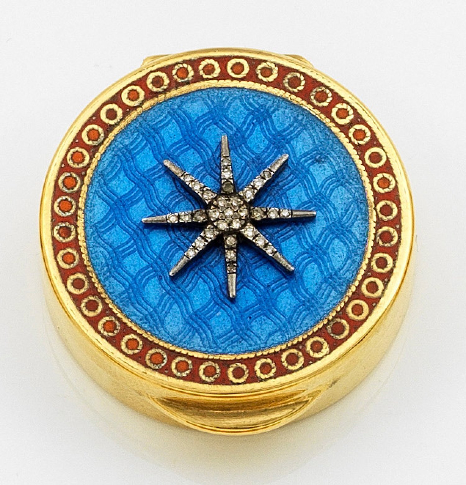 im Stil von Karl Fabergé. Silber, vergoldet und teilw. emailliert. Flacher, zylindrischer Korpus. Scharnierter Deckel, zentral besetzt mit appliziertem Stern, ausgefasst mit Diamantrosen über hellblau emailliertem und gitterähnlich guillochiertem Grund, gerahmt von rot emailliertem Zierband mit kreisförmigem Dekor. Schmaler Drücker. Gest. 88. Gew. ca. 30 g. H. 1,2 cm. D. 3,5 cm.