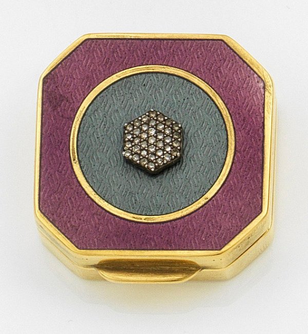 im Stil von Karl Fabergé. Silber, vergoldet und emailliert. Quadratischer Korpus mit gekanteten Ecken. Scharnierter Deckel, zentral besetzt mit kleinem, appliziertem Hexagon, ausgefasst mit Diamantrosen über grau emailliertem und guillochiertem Grund. Umlaufend ein himbeerfarben emaillierter Rahmen mit goldener Profillinie. Gest. 88. Gew. ca. 30 g. H. 1,2 cm. 3 cm x 3 cm.