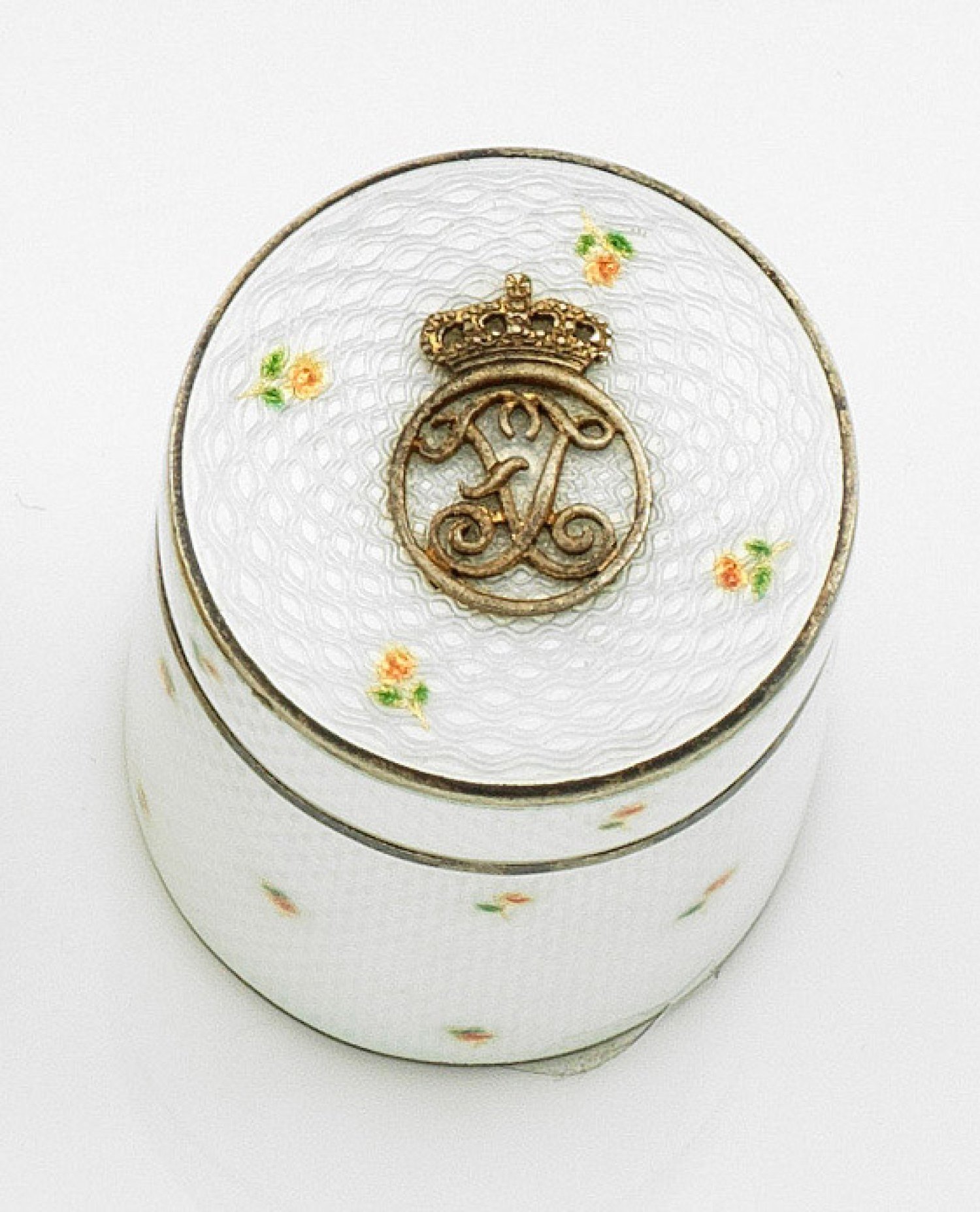 Silber, emailliert. Über flachem Stand, zylindrischer Korpus mit Steckdeckel. Wandung umzogen von zarten polychromen Streublumen über transluzidem, eisgrau emailliertem und wellenförmig guillochiertem Grund. Auf dem Deckel appliziert das durchbrochen gearbeitete Monogramm "FJ" unter Erzherzogsskrone von Franz Joseph von Österreich-Toskana und Erzherzog von Österreich (1905 - 1975). Gest., Beschauzeichen, Meister Johann Souval (tätig um ca. 1915). Innen vergoldet. Gew. ca. 25 g. H. 3,4 cm. D. 2,6 cm.