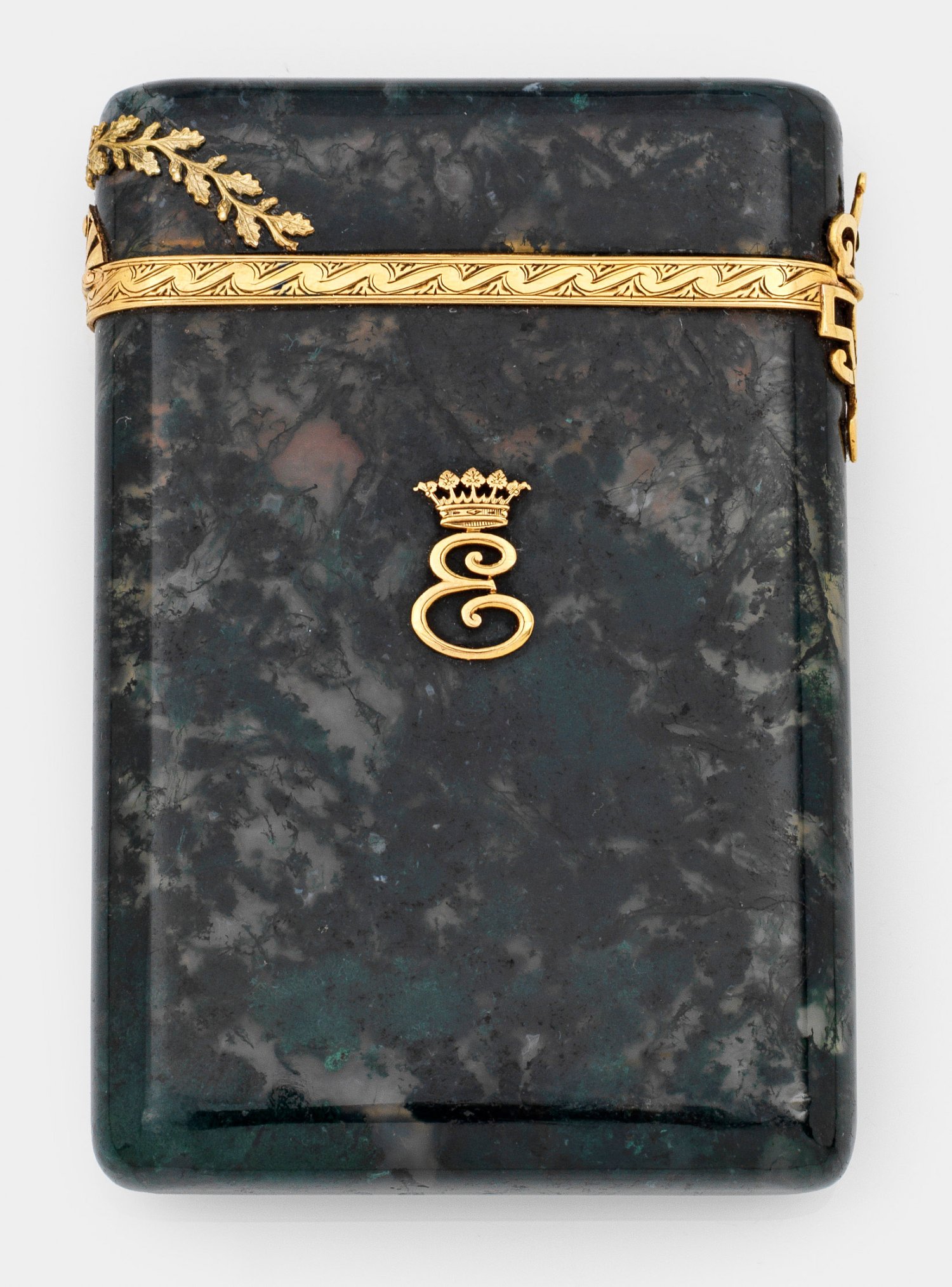 Moosachat mit Goldmontierung. Mit Etui. Hochrechteckiger Korpus mit ovaler Bodenfläche und gerundeten Ecken und Kanten aus durchscheinendem, poliertem Moosachat. Schauseitig appliziertes "E" unter Krone. Der seitlich befestigte Scharnierdeckel verziert mit Eichenlaubzweig und umlaufend fein wellenförmig graviert. Durchbrochen gearbeiteter, ornamentierter Drücker. Gest., französische Garantiemarke seit 1838, undeutliche Meistermarke. H. 8,5 cm. 5,5 cm x 1,2 cm.