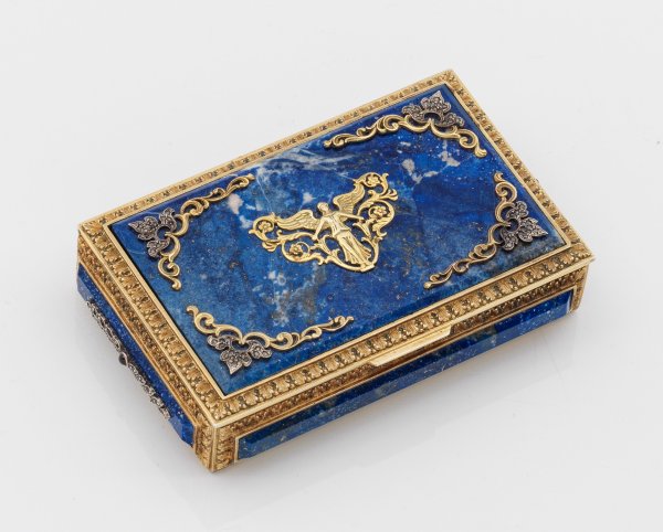 im Stil von Karl Fabergé. In originalem Etui. Silber, vergoldet und Lapislazuli. Rechteckiger Korpus. Wandung und Deckel belegt mit gefassten, facettiert geschliffenen Lapislazulipanelen. Auf dem Deckel zentral appliziertes Zierornament mit Blattranken und stilisierter Darstellung der Siegesgöttin Victoria, umzogen von Blütenkelchdekor, ausgefasst mit Diamantrosen. Die Kanten von zartem Blattdekor umzogen. Auf den Kurzseiten je ein mit Diamantrosen und rotem Farbsteincabochon besetzter Blattzweig. Gest. 88. H. 2,5 cm. 11,5 cm x 7 cm.