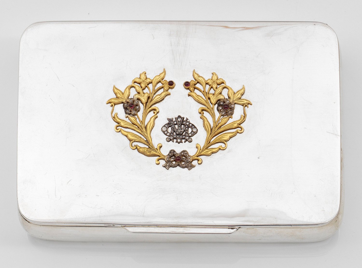 im Stil von Karl Fabergé. Silber, teilw. vergoldet. Länglich rechteckiger Korpus mit gerundeten Ecken. Auf dem scharnierten Deckel zentral appliziertes, ligiertes und reich verziertes Monogramm, flankiert von feinen Blattranken mit Blüten, besetzt mit kleinen Diamantrosen und Farbsteincabochons. Schmaler Drücker. Gest. 84. Gew. ca. 350 g. H. 2,5 cm. 14,5 cm x 9,5 cm.