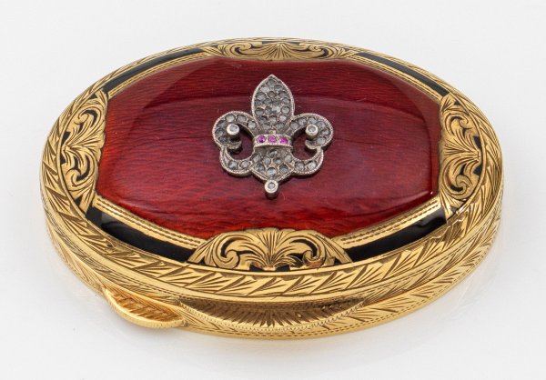 im Stil von Karl Fabergé. Silber, vergoldet und teilw. emailliert. Ovaler Korpus mit aufgewölbtem, wellenförmig guillochiertem und taubenblutrot emailliertem Scharnierdeckel. Zentral besetzt mit stilisierter Lilie, ausgefasst mit kleinen Diamantrosen und Farbsteincabochons. Schwarz emaillierter, schmaler Rahmen, gegliedert von vier ziselierten Blattornamenten. Wandung und Bodenunterseite fein und üppig graviert mit Blattbordüren. Gest. 88. Gew. ca. 80 g. H. 1,8 cm. 6,5 cm x 4,5 cm.