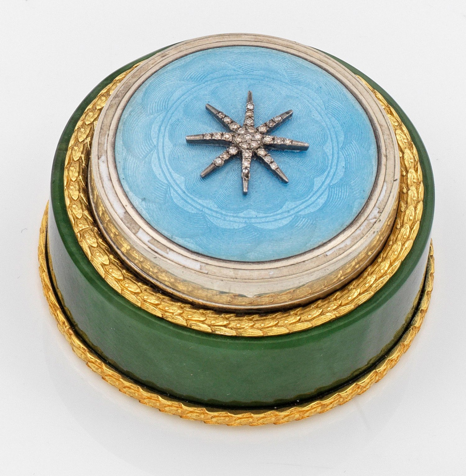 im Stil von Karl Fabergé. Silber, teilw. vergoldet und emailliert. Zylindrischer Korpus aus Nephrit. Die Ränder umzogen von reliefiertem Lorbeerblattkranz. Auf gering gewölbtem Deckel ein applizierter Stern, mit Diamantrosen besetzt, über eisblau emailliertem und fein guillochiertem Grund. Gest. 88. H. 3 cm. D. 5,5 cm.