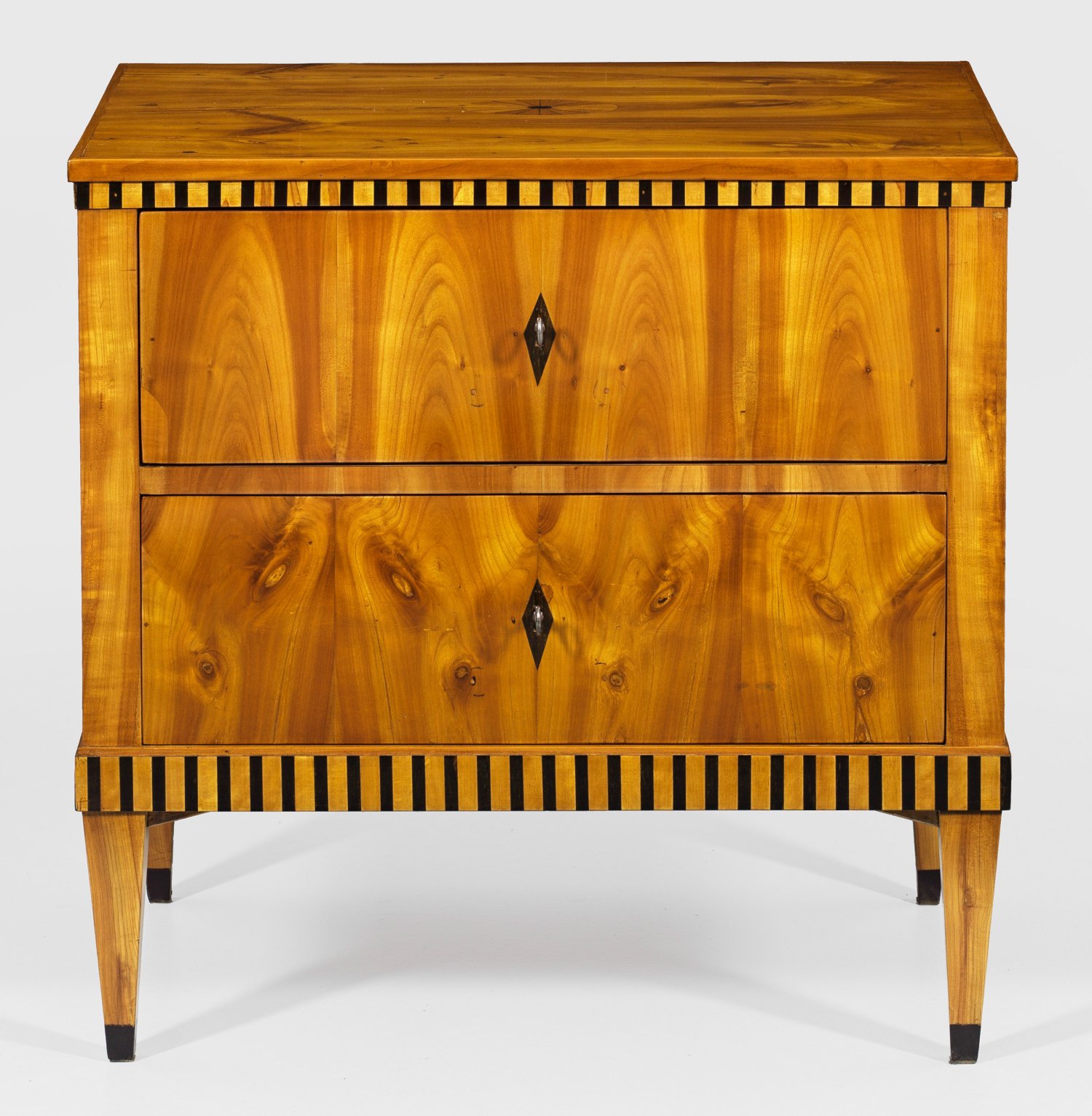 Kirschbaum, furniert sowie teilw. ebonisiert. Gerader, rechteckiger Korpus auf schmaler Zarge und konischen Vierkantbeinen. In der gegliederten Front zwei Schubladen. Dem Korpus entsprechende Deckplatte mit Rosettenmotiv. H. 71,5 cm. 72,5 cm x 48 cm.