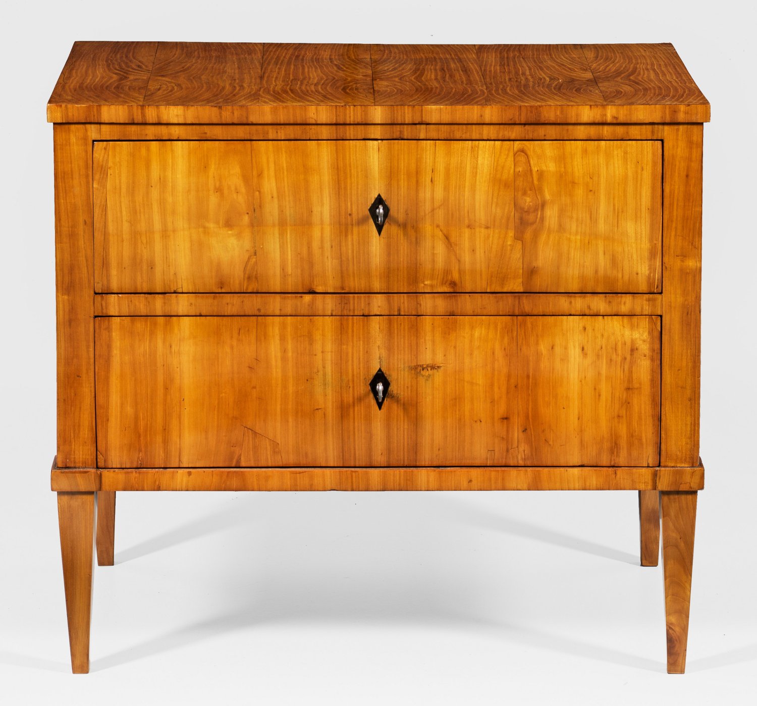 Kirschbaum und Rüster, auf Eichenholz furniert. Gerader, querrechteckig angelegter Korpus auf konischen Vierkantbeinen. In der gegliederten Front zwei breite Schubladen. Deckplatte dem Korpus entsprechend. Erg.; H. 78 cm. 87 cm x 51 cm.