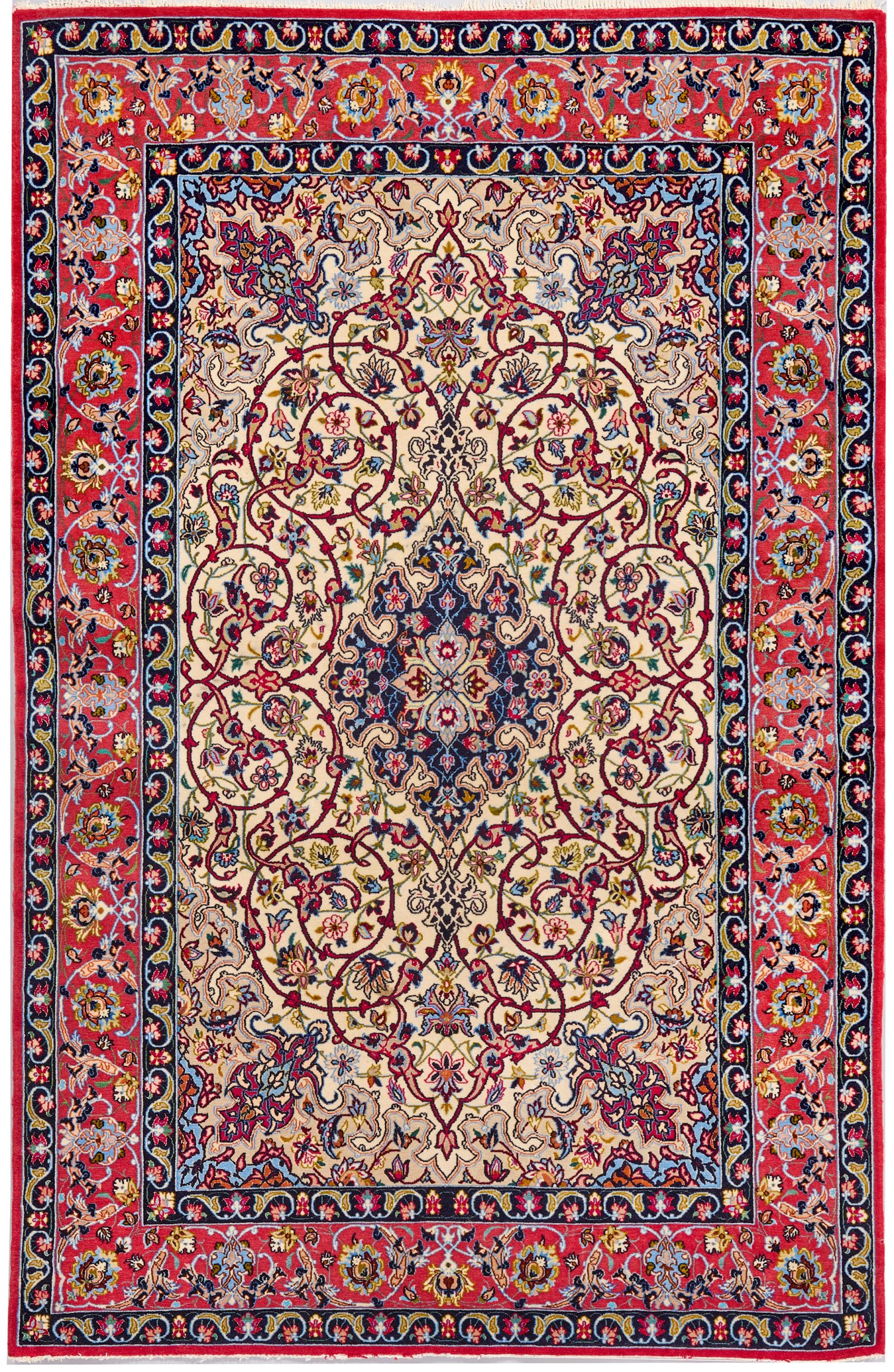 Persien. Korkwolle mit Seide auf Seide. Im cremefarbenen Innenfeld blaues Zentralmedaillon und beigefarbene Ecklösungen. Flächendeckende Musterung aus arabesk angeordneten Ranken. Umlaufend breite, hellrote Palmettenbordüre, flankiert von Bändern. 163 cm x 108 cm.