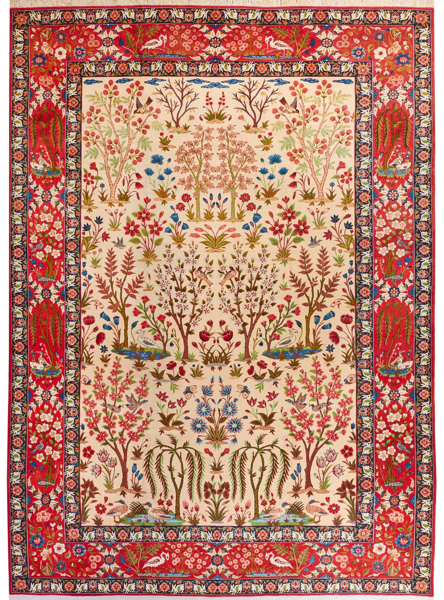 Persien. Mitte 20. Jh.; Wolle auf Baumwolle. Im cremefarbenen Innenfeld flächendeckend dichte Paradiesgarten-Musterung aus unterschiedlichen Baum- und Blütenmotiven. Umlaufend breite, hellrote Bordüre mit korrespondierender Musterung sowie Reihern, flankiert von Blütenbändern. 408 cm x 285 cm.