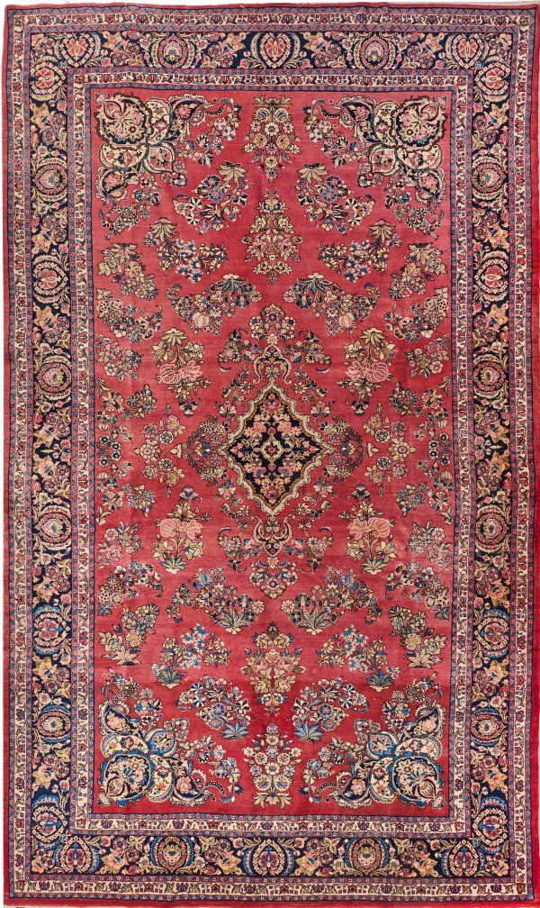 Persien. Wolle auf Baumwolle. Im hellroten Innenfeld rautenförmiges Zentralmedaillon sowie palmettenartige Ecklösungen. Flächendeckende Musterung aus Blütenrispen. Umlaufend breite, dunkelgrundige Palmettenbordüre. 520 cm x 327 cm.