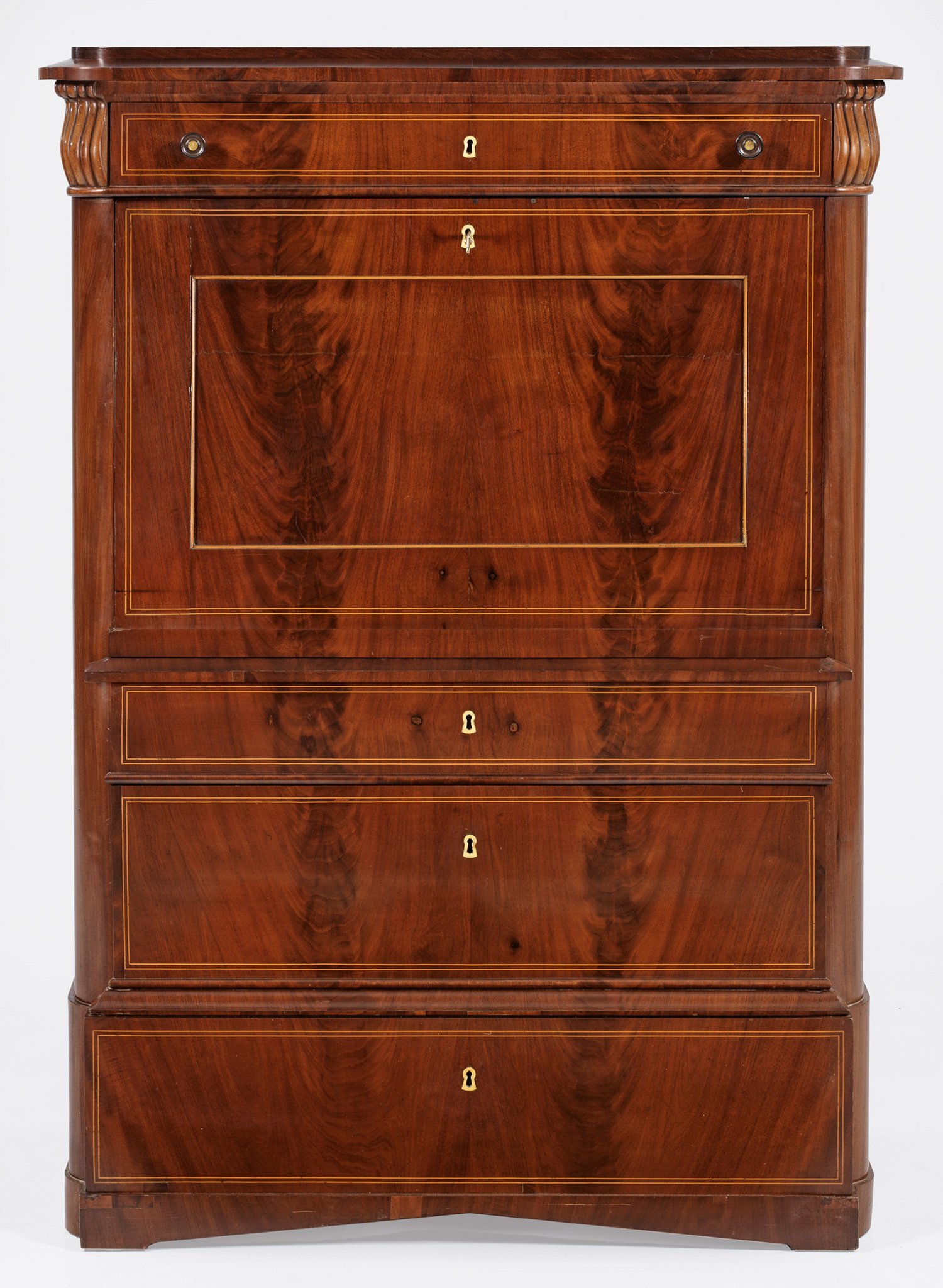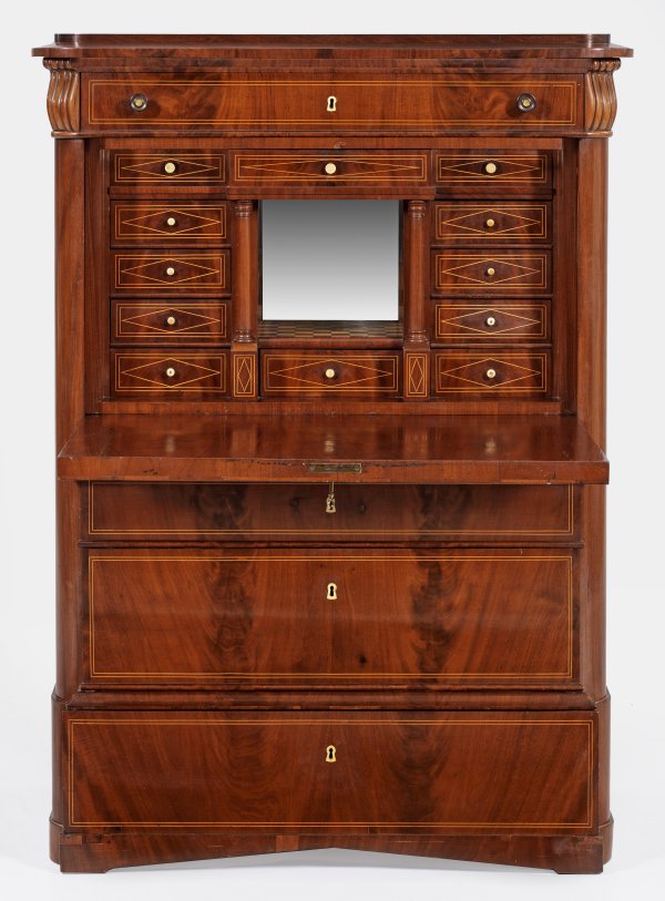 Mahagoni, furniert sowie Einlagen aus Zitronenholz. Gerader, hochrechteckiger Korpus, flankiert von gerundeten Ecklisenen auf gekanteten Beinen. In der gegliederten Front vier Schubladen unterschiedlicher Größe sowie abklappbare Arbeitsfläche. Dahinter gestaffelte Facheinteilung mit Balusterknöpfen aus Knochen. Gestuft ansteigende Deckplatte. H. 145,5 cm. 107 cm x 51 cm.