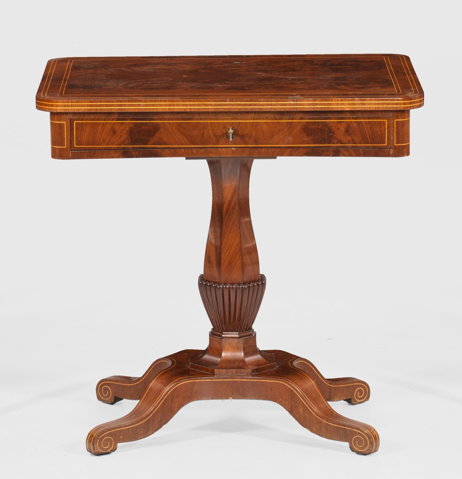 Mahagoni, furniert sowie Einlagen aus Zitronenholz. Gerader, einschübiger Zargenkasten mit gerundeten Ecken auf mehrfach gegliedertem, gekantetem und teilw. godroniertem Balusterschaft sowie geschweiften Füßen. Gering überstehende Deckplatte. H. 72,5 cm. 75 cm x 52 cm.