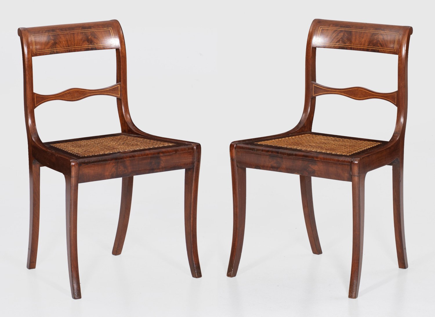 Mahagoni, furniert sowie Einlagen aus Zitronenholz. Trapezförmige Zarge auf leicht ausgestellten Vierkantbeinen. Rechteckige, gering zurückschwingende Rückenlehne mit breitem oberen Abschluss. Sitzfläche aus Rohrgeflecht. Dazu lose Polsterauflagen. Sitz-H. 46 cm.