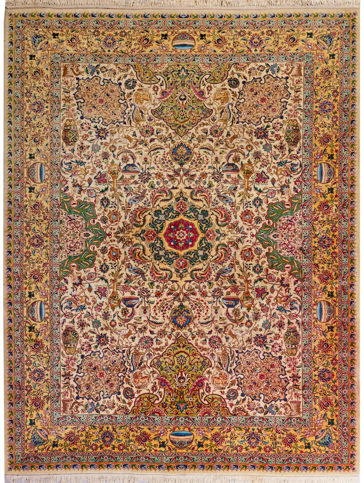 Persien. Mitte 20. Jh.; Wolle auf Baumwolle. Im elfenbeinfarbenen Innenfeld Zentralmedaillon mit Anhängern sowie große Kartuschenmotive in Beige- und Grüntönen. Flächendeckende Musterung aus dichten Palmettenranken und Vasenmotiven. Umlaufend breite, gelbe Blütenbordüre. Sign.; Colourrun. 300 cm x 390 cm.