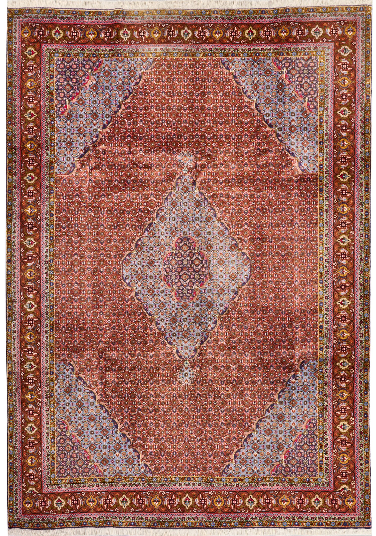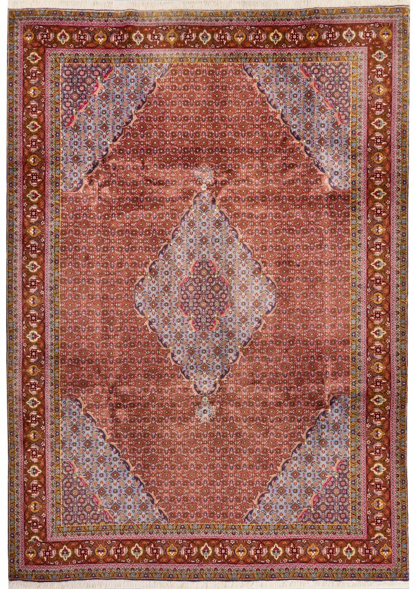 Persien. Wolle auf Baumwolle. Im roten Innenfeld großes, rautenförmiges, hellblaues Zentralmedaillon mit Anhängern sowie korrespondierende Ecklösungen. Flächendeckend dichte Rapportmusterung. Umlaufende Bordüre mit Rankenwerk, begrenzt von schmalen Bändern. 204 cm x 285 cm.