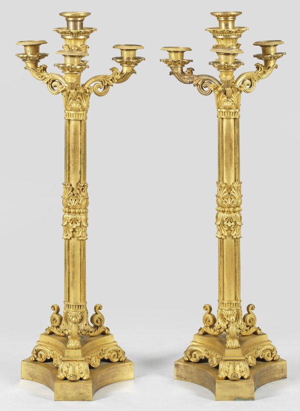 4-flg.; Bronze, vergoldet. Über dreiseitig konkav eingezogener Basis korrespondierendes Sockelelement mit eingerollten Blattvoluten. Oberhalb gestreckter Rundschaft, flankiert von godronierten Streben sowie mit reliefplastischen Blattelementen als Träger für geschwungene Leuchterarme mit zylinderförmigen Tüllen. H. 65,5 cm.