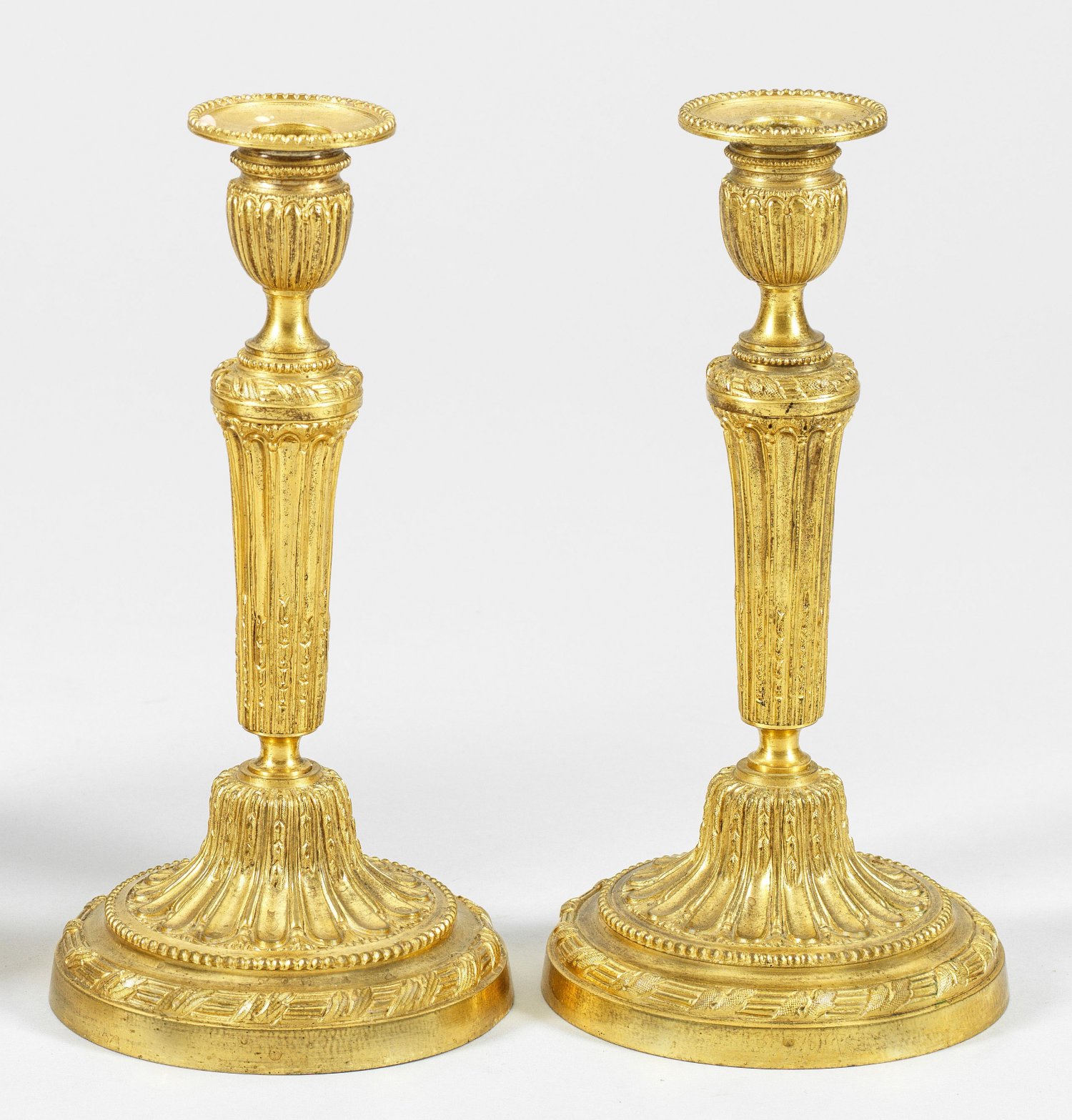 A pair of French gilt bronze Louis XVI style candlesticks.