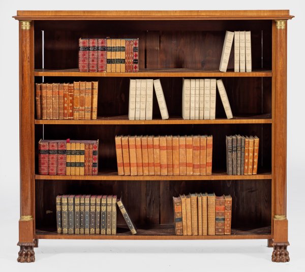 Mahagoni, furniert. Gerader, querrechteckig angelegter, offen gestalteter Korpus, flankiert von eingestellten Vollsäulen auf schmaler Zarge und plastischen Tatzenfüßen. Variable Facheinteilung. H. 126 cm. 140 cm x 39,5 cm.