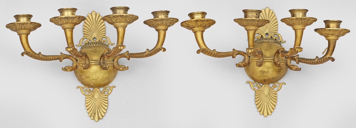 4-flg.; Bronze, vergoldet. Wandschild in Form einer Halbkugel mit reliefplastischen Palmettenabschlüssen. Davon ausgehend stark geschwungene, blattreliefierte Leuchterarme mit Schwanenköpfen sowie zylinderförmigen Tüllen über flachen Traufschalen mit Palmettenfries. Bohrung für Elektrifizierung. H. 21 cm.