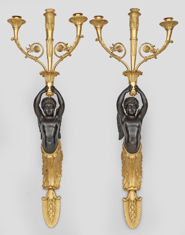 3-flg.; Bronze, vergoldet sowie teilw. dunkel patiniert. Vollplastische Darstellung einer geflügelten Hermenfigur, sich aus einer großen Blattkartusche erhebend als Träger für Leuchterarme in Form von eingerollten Blattvoluten. Bez. Nick. H. 67 cm.