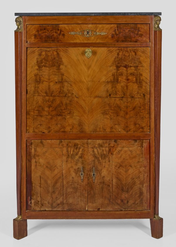 Mahagoni, furniert. Gerader, hochrechteckiger Korpus, flankiert von schräggestellten Ecklisenen mit Karyatiden aus ägyptischen Pharaonenköpfen auf gekanteten Füßen. In der gegliederten Front zwei Türen sowie abklappbare Schreibplatte mit eingelegter Arbeitsfläche aus goldgeprägtem, grünem Leder. Dahinter gestaffelte Facheinteilung. Oberhalb breite Schubladen. Gering überstehende Deckplatte aus anthrazitfarbenem Marmor. H. 148 cm. 97,5 cm x 47 cm.