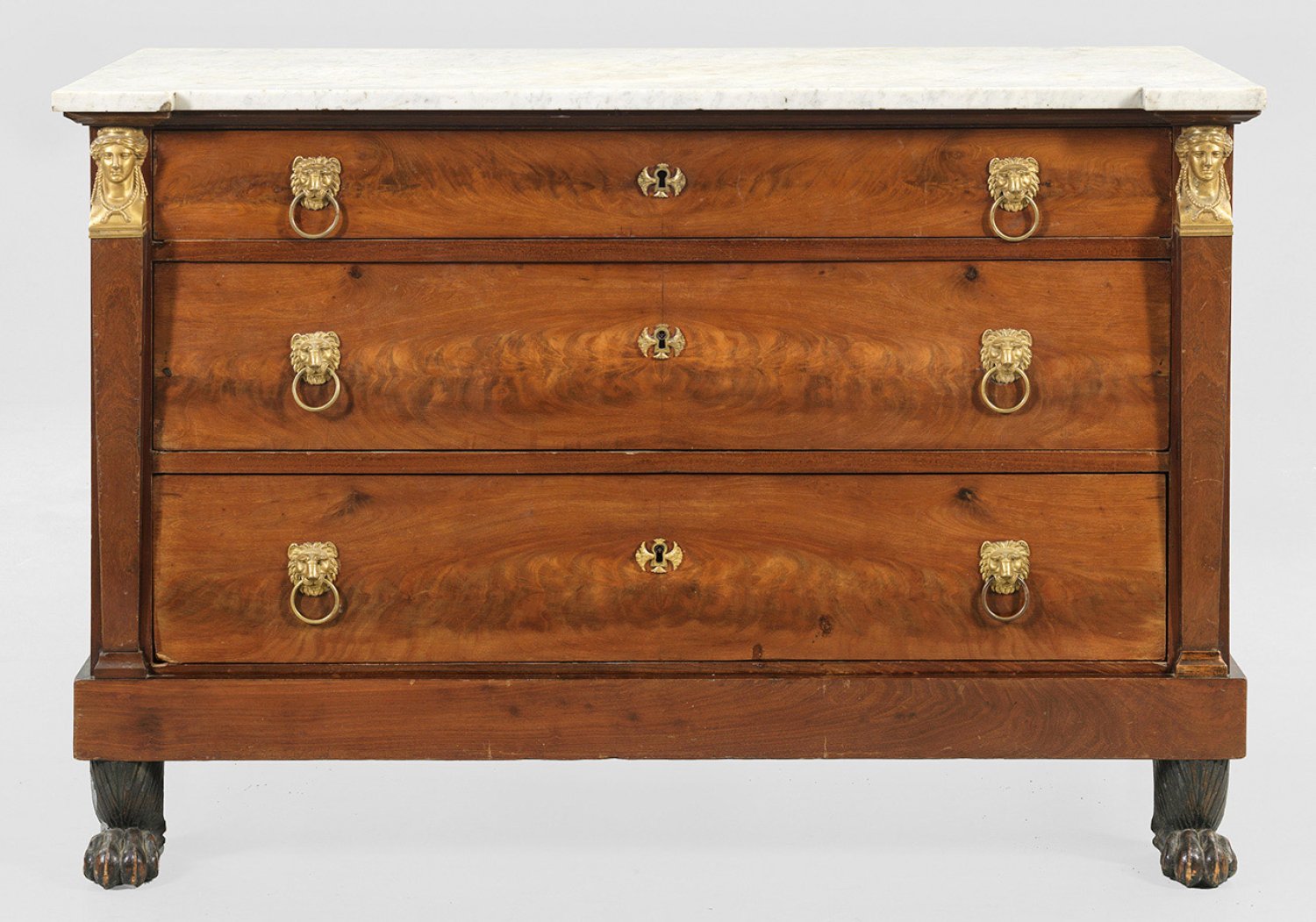 Mahagoni, auf Eichenholz, furniert. Gerader Korpus, flankiert von eingestellten weiblichen Karyatiden auf geradem Zargensockel und reliefplastischen Tatzenfüßen. In der gegliederten Front drei breite Schubladen unterschiedlicher Größe mit Löwenmaskarons und Greifringen. Korrespondierende, an den Ecken verkröpfte Deckplatte aus weißem Marmor. H. 88 cm. 130 cm x 63 cm.