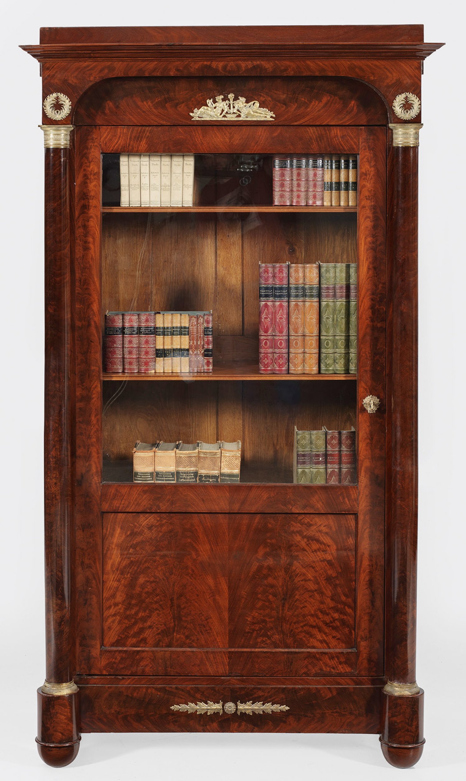 Mahagoni, furniert. Gerader, hochrechteckiger Korpus, flankiert von eingestellten Vollsäulen mit reliefierten Basen und Kapitellen auf gerundeten Füßen. In der gegliederten Front große Vitrinentür. Innen variable Einlegeböden. Segmentartiger oberer Abschluss mit gestuft ansteigendem Profilgesims. H. 205 cm. 112 cm x 55 cm.