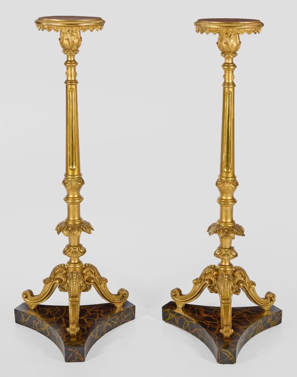 Holz, in Marmoroptik gefasst sowie stuckiert und vergoldet. Über dreiseitig konkav eingezogener Sockelplatte geschweift ansteigende Streben aus eingerollten Voluten. Oberhalb mehrfach gegliederter, tief kannelierter und blattreliefierter Säulenschaft als Träger für runde, profilierte Deckplatte. H. 133 cm.