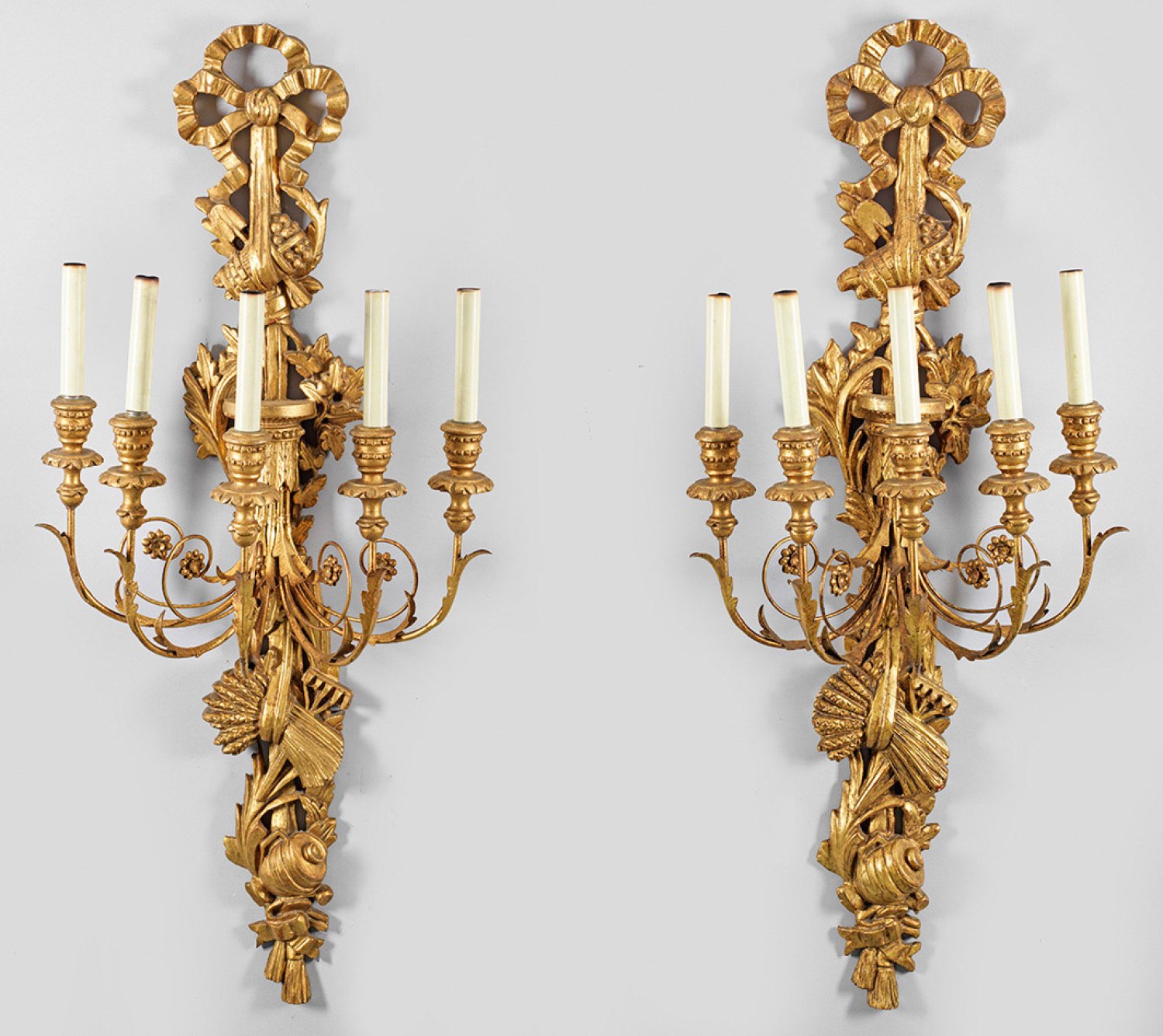 5-flg.; Holz, geschnitzt, gefasst und vergoldet. Durchbrochen gearbeitetes Wandschild aus gewundenen und schleifenbekrönten Blattmotiven sowie reliefiertem Ährenbündel. In der Mitte davon ausgehend stark geschwungene Metallleuchterarme aus eingerollten Voluten mit vasenförmigen Tüllen als Träger für Leuchtmittel. H. 110 cm.