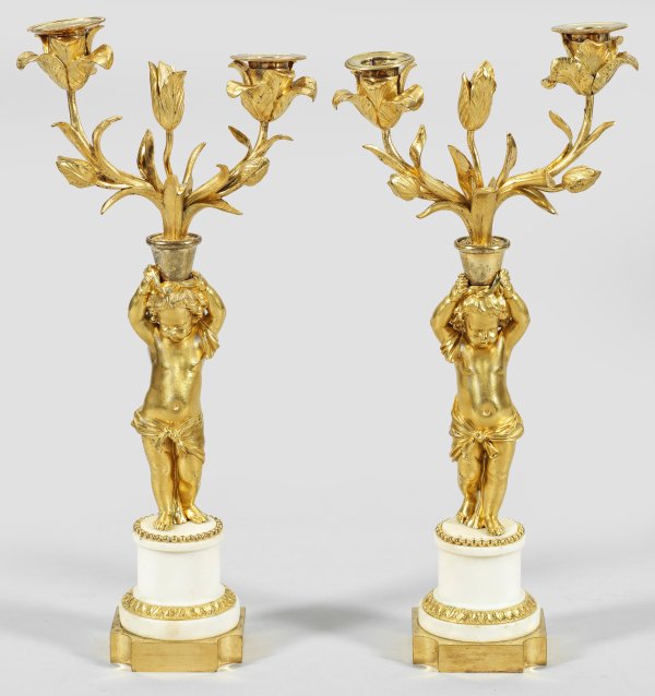 Gegenstücke. 2-flg.; Bronze, feuervergoldet und weißer Marmor. Über flacher Plinthe mit konkav eingezogenen Ecken kurzer Säulenschaft mit fein reliefiertem Palmettenfries und Perlstab. Oberhalb vollplastisch gestalteter Putto als Träger für Girandolenelement in Form von Blütenzweigen. Unw. besch.; H. 41 cm.