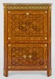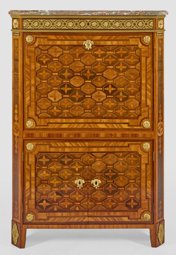 Rosenholz und Amaranth, furniert sowie Einlagen aus teilw. gefärbten Hölzern. Gerader, hochrechteckig angelegter Korpus, flankiert von breiten, schräggestellten Ecklisenen, in gekantete Füße übergehend. In der gegliederten Front zwei Türen sowie abklappbare Arbeitsfläche. Dahinter gestaffelte Facheinteilung mit Gefäßen für Tinte und Streusand. Oberhalb flaches Schubfach. Flächendeckend breit gerahmte Rautenfelder, von Bandeinlagen begrenzt. Applikationen aus feuervergoldeter Bronze. Schlagstempel-Sig. P.PIONIEZ (wird Meister 1765) sowie Pariser Jury-Stempel JME. Profilierte Deckplatte aus rotbraunem, grau-weiß gemasertem Marmor, rest.; H. 134 cm. 92 cm. x 35 cm.