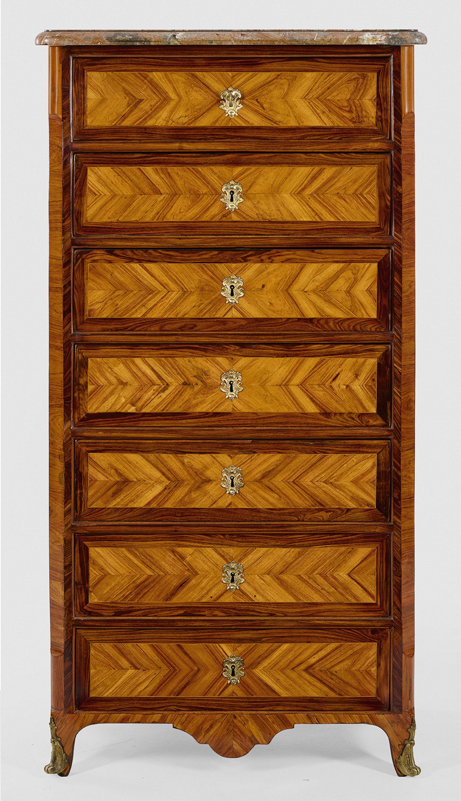Palisander und Rosenholz, furniert. Gerader, hochrechteckiger Korpus, flankiert von schräggestellten Ecklisenen, in leicht ausgestellte Füße übergehend. In der gegliederten Front sieben Schubladen. Flächendeckend breit gerahmte, gespiegelt angeordnete Furnierfelder. Gering überstehende Deckplatte aus rotbraun und grau gemasertem Marmor. H. 149 cm. 77 cm x 46 cm.
