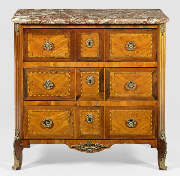 Nussbaum und Rosenholz, furniert sowie Einlagen aus unterschiedlichen, teilw. gefärbten Hölzern. Gerader, querrechteckig angelegter Korpus, flankiert von schmalen, schräggestellten Ecklisenen mit Scheinkanneluren auf geschweiften Beinen. In der gegliederten Front drei Schubladen. Gering überstehende, rest. Deckplatte aus rotbraunem, grauweiß gemasertem Marmor. H. 92 cm. 92 cm x 43,5 cm.