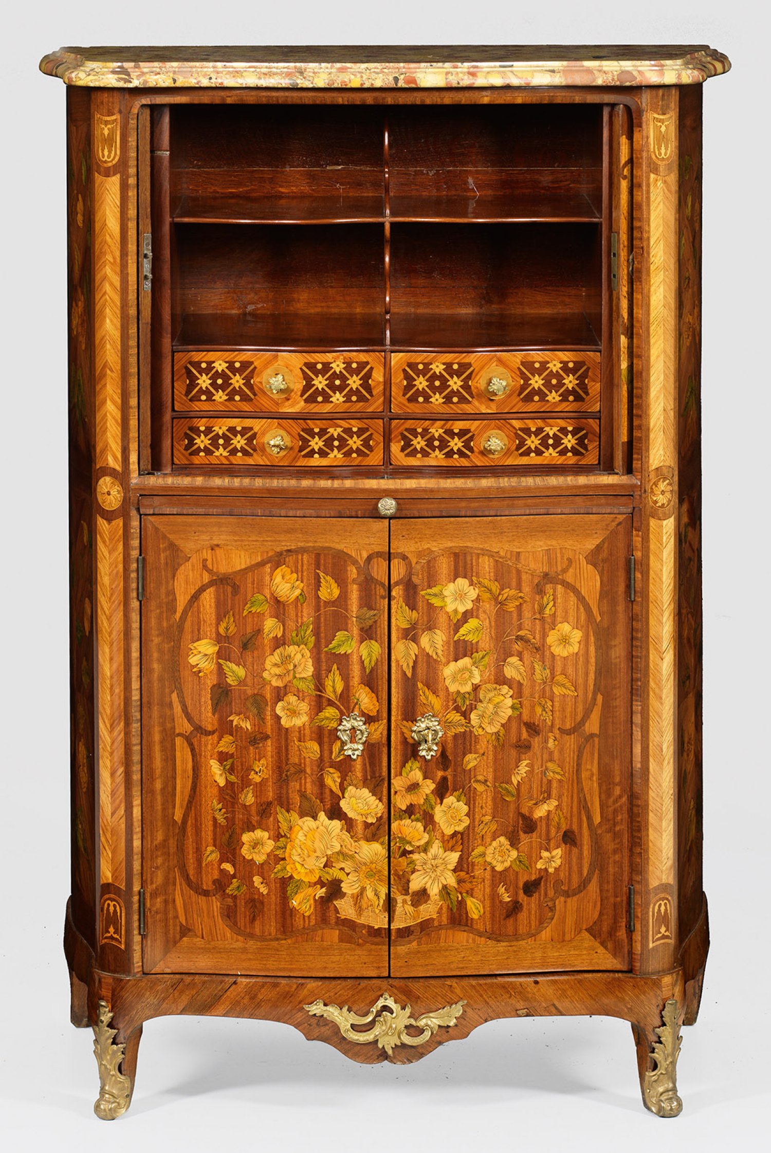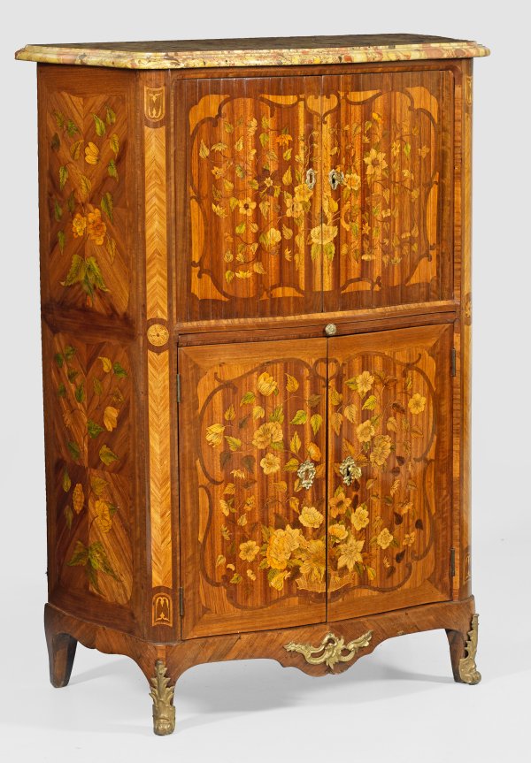 Rosenholz und Palisander, furniert sowie teilw. grün gefärbte Einlagen aus unterschiedlichen Hölzern. Dreiseitig bombierter Korpus, flankiert von gerundeten Ecklisenen, in leicht geschweifte Füße übergehend. In der gegliederten Front zwei Türen, ausziehbare Arbeitsfläche sowie oberhalb zweigeteilter Rolloverschluss. Dahinter gestaffelte Facheinteilung. Flächendeckend breit gerahmte, gespiegelt angeordnete Furnierfelder mit üppiger Blütenmarketerie. Schlagstempel-Sign. DELORME (wird Meister 1748). Profilierte Deckplatte aus cremefarbenem, roséfarben gemasertem, sog. Breche d'Alep-Marmor. H. 118,5 cm. 83 cm x 44 cm.
