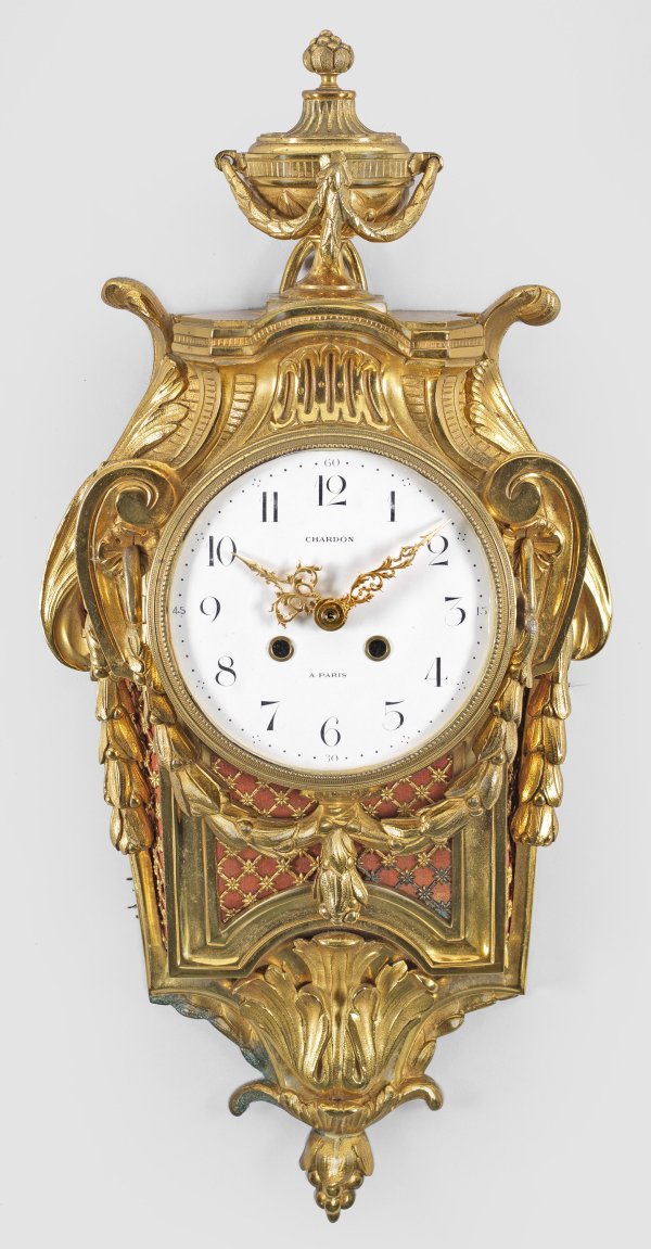 Bronze, vergoldet. Balusterförmiger Korpus aus rot hinterlegtem Gitterwerk sowie Volutenmotive, durch üppige Lorbeerfestons verbunden. Vasenbekrönung. Verglastes Emailzifferblatt bez. Chardon à Paris. Quarzwerk. H. 44 cm.