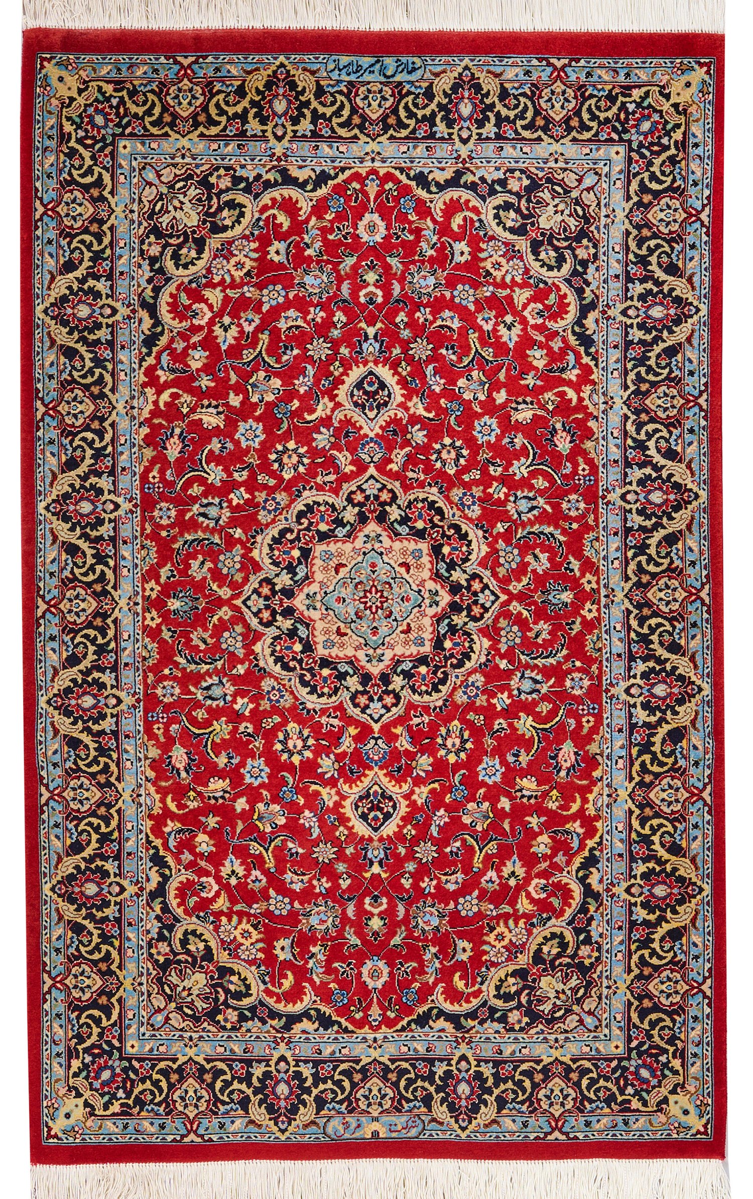 Persien. Korkwolle mit Seide auf Baumwolle. Im roten Innenfeld dunkelgrundiges Zentralmedaillon mit Anhängern sowie korrespondierende Ecklösungen. Flächendeckende Musterung aus Blütenranken. Umlaufend breite, korrespondierende Palmettenbordüre. Sign.; 125 cm x 76 cm.
