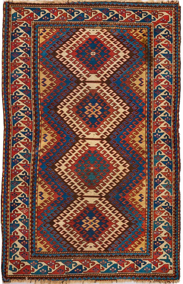 Kaukasus. Um 1940. Wolle auf Wolle. Im gelben Innenfeld vier gereihte, gestaffelt von Hakenbändern gerahmte Rauten, in unterschiedlichen Blau- und Rottönen. Umlaufend breite, elfenbeinfarbene Ornamentbordüre. 120 cm x 190 cm.