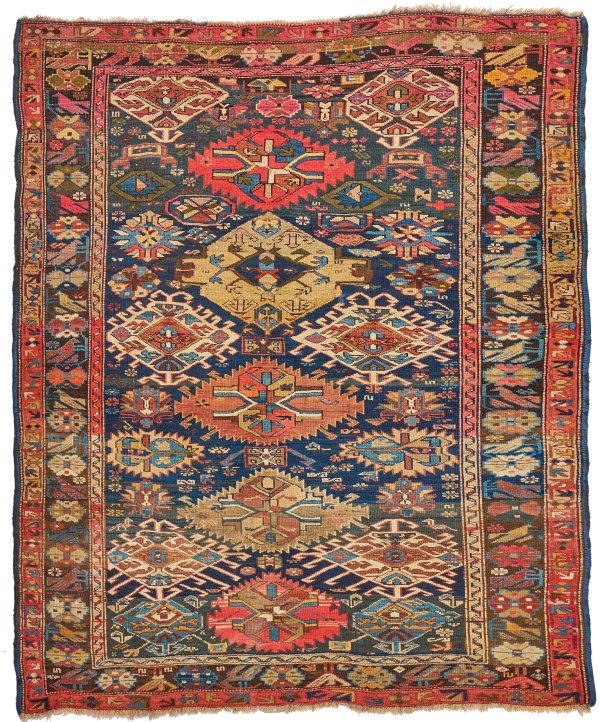 Kaukasus. Um 1900. Wolle auf Wolle. Im blauen Innenfeld flächendeckende Musterung aus unterschiedlichen, teilw. hakenbesetzten Rauten- und Rosettenmotiven. Umlaufend breite Bordüre aus stilisierten Blütenrosetten, flankiert von schmalen Bändern. 156 cm x 192 cm.