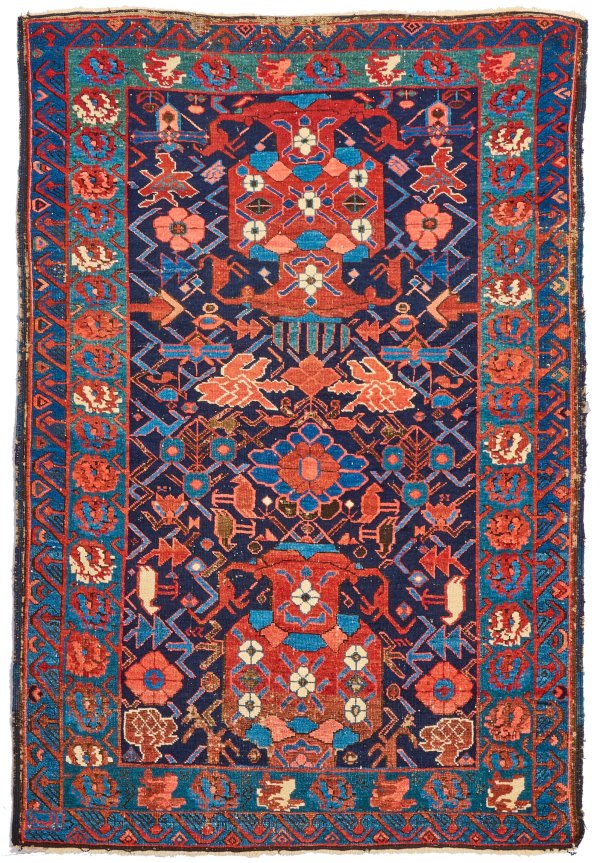 Kaukasus. Um 1920. Wolle auf Wolle. Im tintenblauen Innenfeld große, rote Schildmotive sowie flächendeckende Musterung aus gekanteten Ranken und Rosetten. Umlaufend breite Bordüre aus stilisierten Blüten. 113 cm x 170 cm.