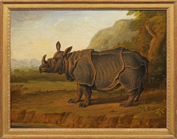 Naturnahe Darstellung in einer Ideallandschaft. "Clara" gehört zu den berühmtesten Tieren in der Natur-, Kultur- und Kunstgeschichte und war die Sensation des 18. Jhs.; Das zahme Indische Panzernashorn wurde 1738 in Bengalen geboren und wurde 1741 bis zum Tod 1758 als Attraktion auf jahrelangen Tourneen in ganz Europa gezeigt. Das vorliegende Gemälde basiert bis auf einige Abweichungen in der Landschaft auf dem berühmten, 1749 geschaffenen Werk Oudrys, das "Clara" lebensgroß zeigt. Schon 1750 erwarb Herzog Christian II. Ludwig zu Mecklenburg(-Schwerin) das monumentale Gemälde vom Künstler. 1750/51 ließ dieser eine kleinere Kopie für seine Gemäldegalerie anfertigen, das Original kam in sein Jagdschloss nach Ludwigslust, wurde später eingerollt und deponiert, erst seit 2004 ist es nach umfassender Restaurierung wieder im Staatl. Museum Schwerin zu sehen. Öl/Lwd., doubl.; 71 cm x 93 cm. Rahmen.