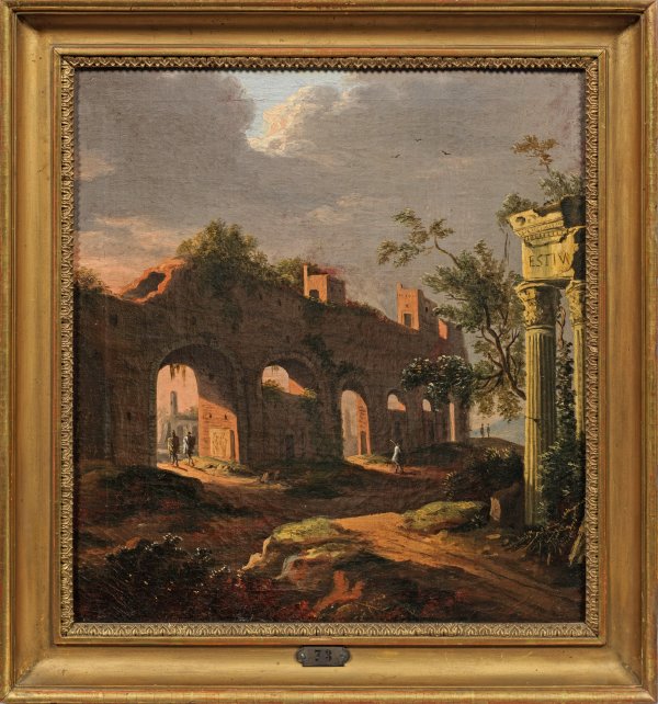 Blick auf die Ruinen eines Aquädukts und eines Tempels mit effektvollen Licht- und Schattenwirkungen. Der Künstler knüpfte mit dieser Landschaft augenfällig an die niederländische Landschaftsmalerei des 17. Jhs. an, insbesondere anAbraham van Cuylenborch d. Ä. (um 1620 - 1658) und Jan Asselijn (um 1610 - 1652), der sich sieben Jahre in Rom aufhielt. Giesel absolvierte seine künstlerische Ausbildung bei Johann Benjamin Müller sowie bei Charles Hutin an der Dresdener Kunstakademie, vervollständigt durch eine Studienreise nach Holland. Seit 1769 beschickte er Dresdner Akademie-Ausstellungen, meist Landschaften oder Genrestücke im niederländischen Stil. 1787-1794 wirkte Giesel als Hofmaler des polnischen Königs in Warschau. Öl/Lwd., doubl.; Verso Stempel des Städt. Museum Halberstadt. 42 cm x 39,5 cm. Rahmen.