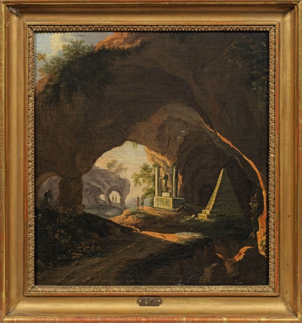 Blick auf bizarre Grotten- und Felsformationen mit effektvollen Licht- und Schattenwirkungen, im Vordergrund eine kleine Pyramide und ein Ruinenelement mit Statue sowie zwei Staffagefiguren. Der Künstler knüpfte mit seiner Grottenansicht augenfällig an die Werke von Abraham van Cuylenborch d. Ä. (um 1620 - 1658) an. Giesel absolvierte seine künstlerische Ausbildung bei Johann Benjamin Müller sowie bei Charles Hutin an der Dresdener Kunstakademie, vervollständigt durch eine Studienreise nach Holland. Seit 1769 beschickte er Dresdner Akademie-Ausstellungen, meist Landschaften oder Genrestücke im niederländischen Stil. 1787-1794 wirkte Giesel als Hofmaler des polnischen Königs in Warschau. Öl/Lwd., doubl.; Verso Stempel des Städt. Museum Halberstadt, Etikett mit Provenienzangabe. 42,5 cm x 40 cm. Rahmen.