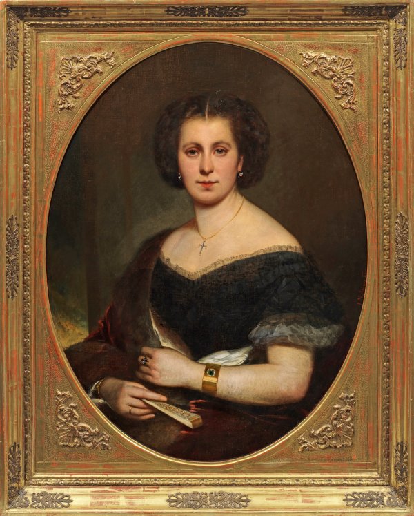 Spätbiedermeierliches, repräsentatives, halbfiguriges, in fein lasierender Malweise ausgeführtes Bildnis der jungen Adeligen, die er in subtiler Weise charakterisiert. Aigner war Schüler von Friedrich von Amerling und Carl Rahl, in der Ringstraßenzeit avancierte er seit Ende der 1850er Jahre zum gefragten Porträtmaler der gehobenen Gesellschaft und des Adels. Sein berühmtestes und bedeutendstes Bildnis ist das lebensgroße Porträt "Kaiserin Elisabeth mit Sternenschmuck und schwarzgoldenem Spitzenüberwurf" aus dem Jahr 1868, das sie in ihrer strahlenden Schönheit wiedergibt. Außerdem porträtierte er u. a. Kaiser Franz Joseph I., Franz Grillparzer, Friedrich Halm und Nikolaus Lenau. Öl/Lwd., doubl.; Rechts am Rand sign. u. dat. dat. "J. M. Aigner (1)860". 86 cm x 67 cm, im Oval. Rahmen.