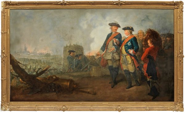 Repräsentatives, großformatiges Historiengemälde. In feinflüssiger Malweise geschildert wird eine vielfigurige Szene während des Pommernfeldzuges 1715/16, in dem ein alliiertes Heer, bestehend aus Preußen, Dänen und Sachsen, gegen Schweden kämpfte und hierbei durch preußische Truppen Stralsund und Rügen erobert wurden. Auf der rechten Gemäldeseite ist der seit 1713 regierende "Soldatenkönig" Friedrich Wilhelm I. von Preußen (1688 - 1740) zu sehen, neben ihm der legendäre preußische Feldmarschall Fürst Leopold I. von Anhalt-Dessau (1676 - 1747), die zusammen erfolgreich die preußischen Truppen kommandierten. Die linke Bildseite wird hingegen von der historisch bedeutenden Belagerungs- bzw. Schlachtenszene dominiert. Der König selbst ist in typischer Pose und Uniform in der Tradition von Antoine Pesne als Befehlshaber dargestellt, über dem Kürass ein gelbes Justeaucorps und blauer Rock mit roten Aufschlägen, auf der linken Brust der Stern des Schwarzen Adlerorden, in der rechten Hand der Marschallstab. Der Schöpfer des vorliegenden, in der überzeugenden Charakterisierung der beiden Hauptfiguren künstlerisch herausragenden Gemäldes, dürfte im Umkreis von Adolph von Menzel und Anton von Werner zu suchen sein. Öl/Lwd., doubl.; 83 cm x 146 cm. Rahmen.
