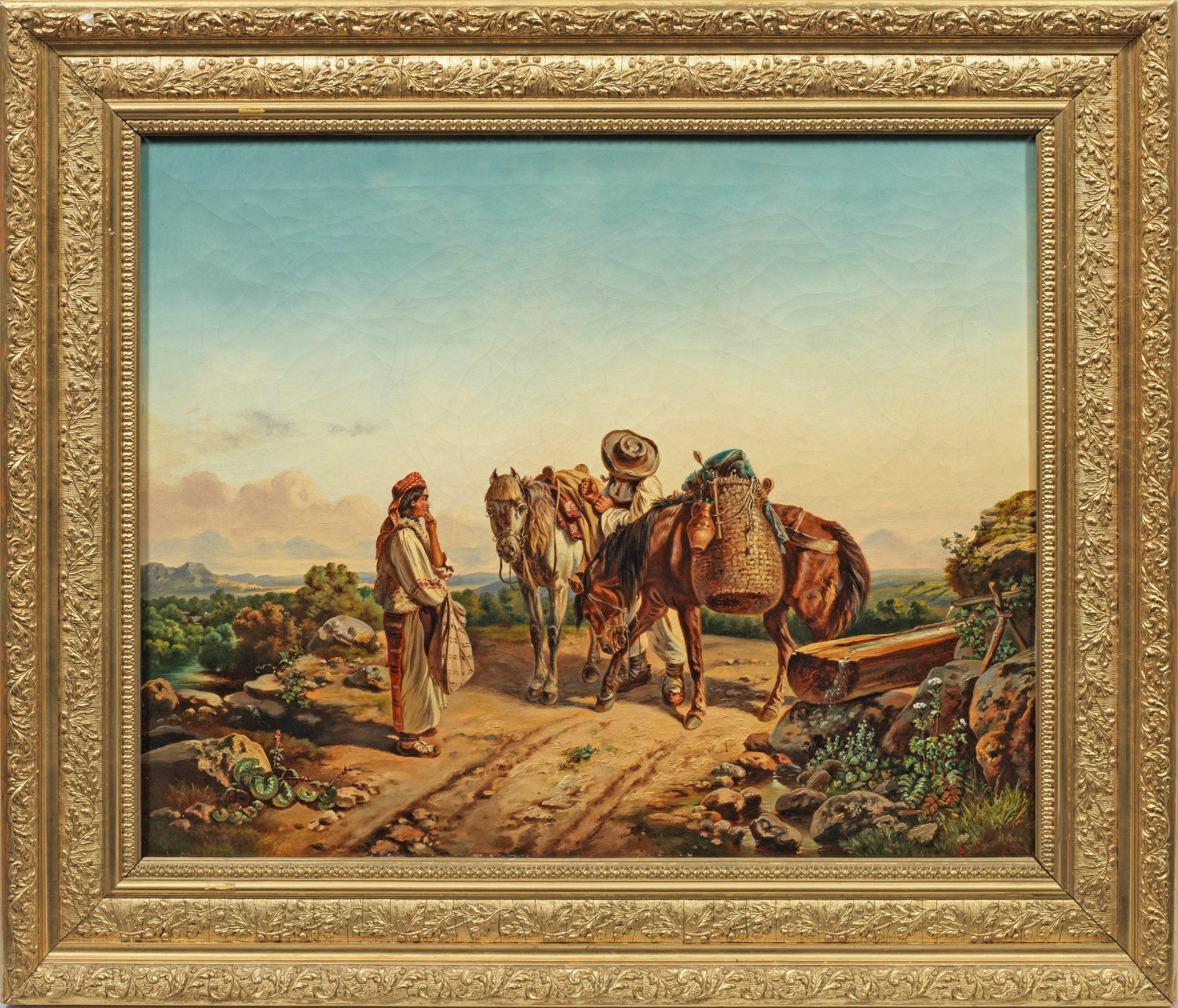 In atmosphärischer Abendstimmung dargestellte, osteuropäische Landschaft, in der zwei Reiter in volkstümlicher Tracht eine Rast einlegen, um ihre Pferde an einer Tränke zu versorgen. Feinflüssige, naturgetreue Schilderung van der Vennes, der in Wien und München tätig war und seit 1870 regelmäßig Ausstellungen in Dresden, Wien, München und Hannover beschickte. Der Künstler schuf vornehmlich stimmungsvolle ländliche Szenen, Reiter- und Pferdemotive aus Bayern und Österreich-Ungarn. Öl/Lwd.; R. u. sign. und dat. (1)861. 55,5 cm x 68,5 cm. Rahmen.
