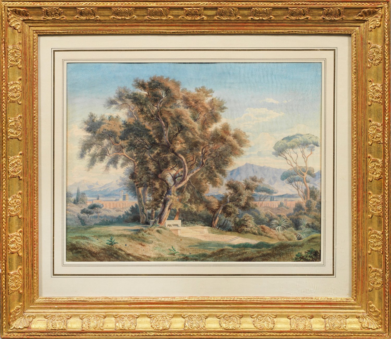Um 1845 entstandene, spätromantische, atmosphärisch gestimmte, poetische Ideal-Landschaft aus der Campagna Romana mit Blick auf eine Bank unter einer Baumgruppe, im Mittelgrund ein Aquädukt. Hummel studierte 1834-1841 bei Friedrich Preller an der Fürstlichen freien Zeichenschule Weimar, 1842-1846 bereiste er Italien und Sizilien. Seit 1856 dauerhaft in Weimar ansässig, wurde Preller 1860 Professor an der neu gegründeten Großherzoglich-Sächsischen Kunstschule. Aquarell/Papier. Ca. 37,5 cm x 47 cm (Passepartoutausschnitt). Rahmen.
