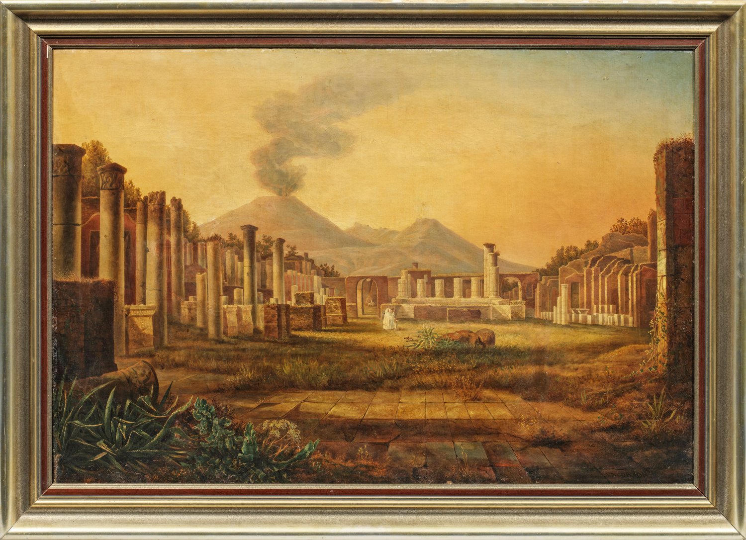 In stimmungsvolles Abendlicht getauchter Blick über die Ruinen Pompejis. Im Hintergrund erhebt sich majestätisch der rauchende Gipfel des Vesuvs. Stil- und sujettypisches Werk Jacobsons, das unter den Eindrücken seiner zweijährigen Italienreise entstanden ist. Öl/Lwd., doubliert. R. u. sign. und dat. 1846. Verso betitelt, bez. und dat.; 66,5 cm x 98,5 cm. Rahmen.