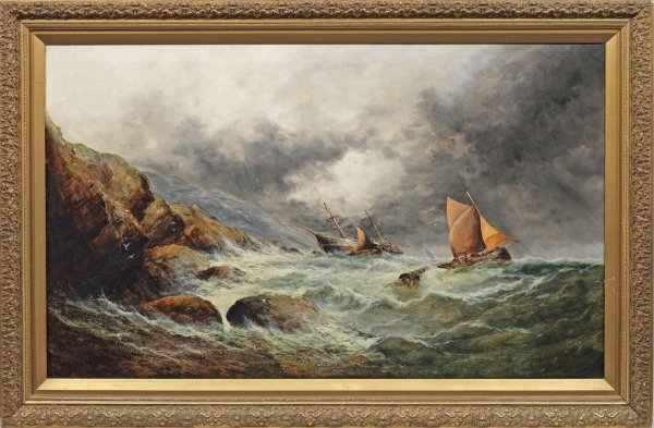 Großes Seestück mit virtuos gemalter Darstellung des Sturms und der Gewalt des Meeres mit hohen, gischtigen Wellen, durch die bereits ein Zweimaster auf Grund lief, während zwei kleinere Fischerboote noch hiergegen ankämpfen. Öl/Lwd., doubl.; L. u. undeutl. sign. u. dat. 1870. 76 cm x 127 cm. Rahmen.