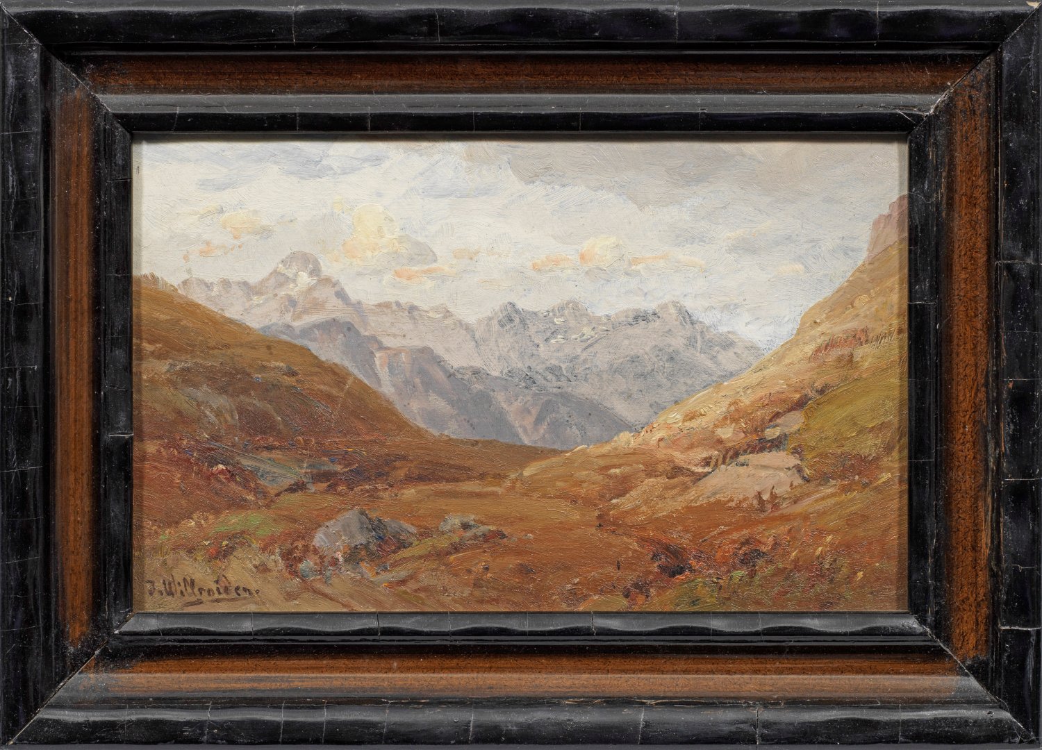 Atmosphärische, in warmen, erdigen Farbtönen gemalte Landschaftsstudie des bekannten Stimmungsimpressionisten, die die Lichtstimmung eines warmen Spätsommertages in den Alpen zwischen Österreich und Slowenien meisterhaft widerspiegelt. Willroider studierte an der Münchner Akademie und ging später nach Düsseldorf, wo er der Künstlervereinigung Malkasten beitrat. Öl/Malkarton. L. u. sign.; Verso bez.; 20,5 cm x 33,3 cm. Rahmen.