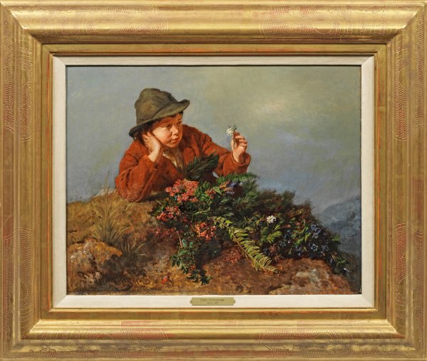 Liegender, traumverloren auf ein gepflücktes Edelweiß blickender Knabe, vor sich weitere Blumen. Motiv- und stiltypisches Genrebild Schlesingers, der 1889 auf der Wiener Jahresausstellung und auf der Dresdener Akademie-Ausstellung das vergleichbare Gemälde "Auf der Alpe" zeigte, das drei Kinder mit Alpenblumen darstellte. Schlesinger studierte an der Düsseldorfer Akademie bei Rudolf Jordan; 1862/63 ließ er sich in München nieder und beschickte bis 1908 mit Darstellungen ländlichen Lebens die nationalen und Wiener Ausstellungen. Als Maler reizvoller und einfühlsam geschilderter Kindermotive, besonders ungebundener Bauernkinder, wurde er schon im 19. Jh. zu einem international gesuchten Künstler. Öl/Velin, auf Holztafel kaschiert. L. u. sign.; 38,8 cm x 49,5 cm. Rahmen.